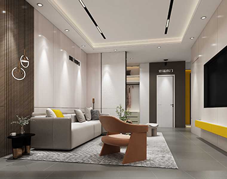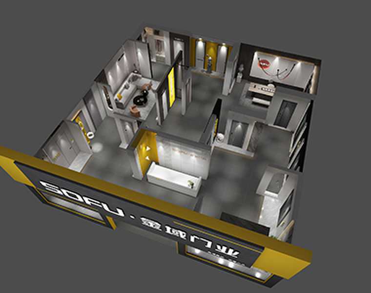 SOFU.金域专卖店VI形象有统一的颜色、材料、布置要求,门头为黄色、深灰色乳胶漆为底,标志为金色亚克力字体,室内统一的白色线型灯、墙板、墙壁为白色、黄色乳胶漆、标志金色亚克力字体灰色地砖。